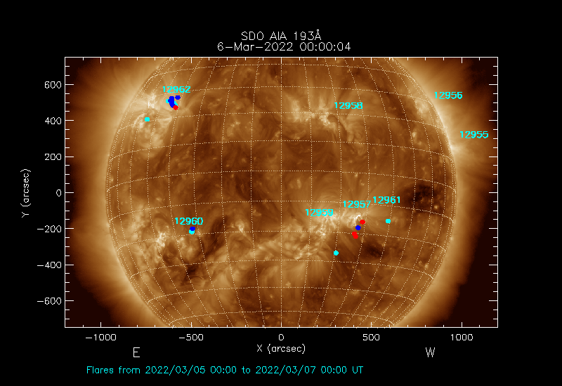The most recent flares (≤12 hours) are shown as red dots, 12-24 hours ago as blue dots and older ones as turquoise dots.
