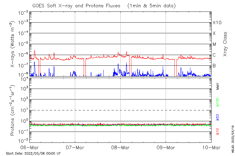 This page provides light-curves generated from GOES soft X-ray and Particle data for the date indicated at the top and the preceding three days.