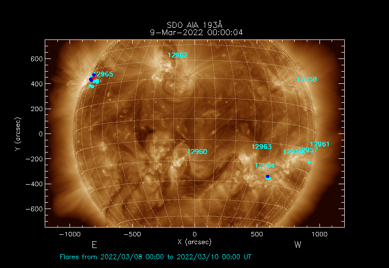 Flares for the 48 hours leading up to the time are over-plotted; these are rotated to the time of the FITS image.