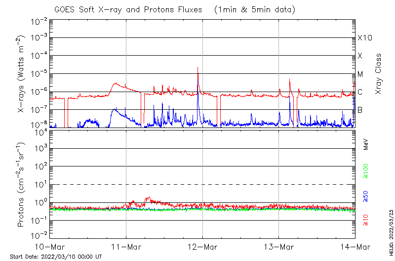 This page provides light-curves generated from GOES soft X-ray and Particle data for the date indicated at the top and the preceding three days.