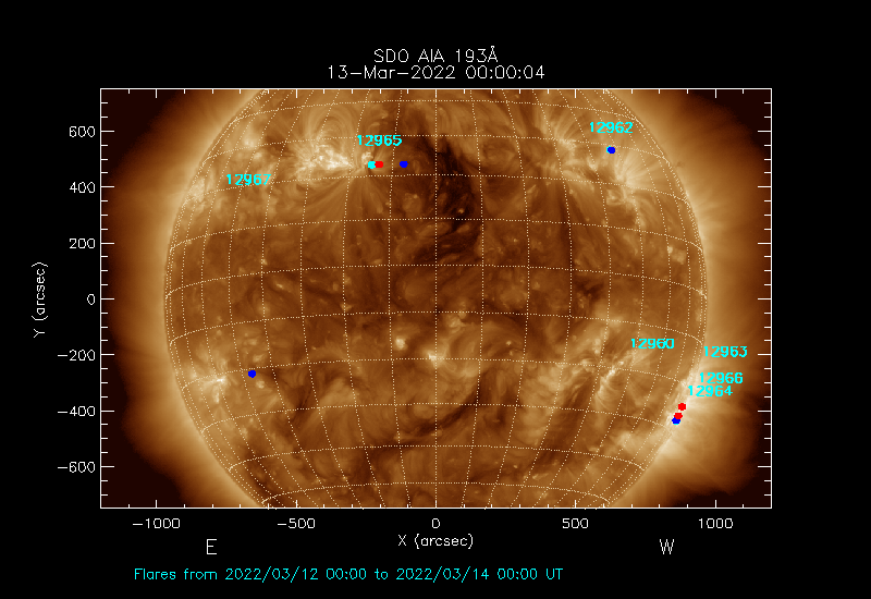 The most recent flares (≤12 hours) are shown as red dots, 12-24 hours ago as blue dots and older ones as turquoise dots.