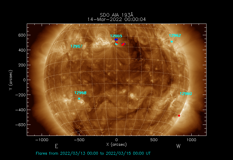The most recent flares (≤12 hours) are shown as red dots, 12-24 hours ago as blue dots and older ones as turquoise dots.