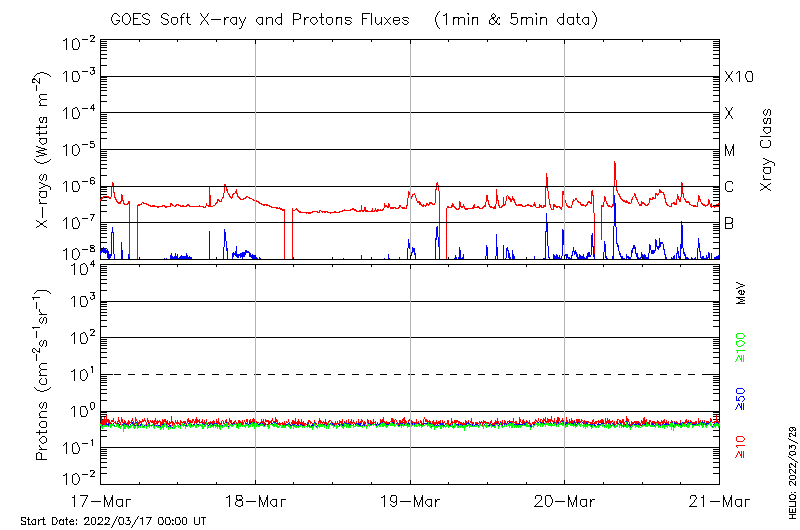 This page provides light-curves generated from GOES soft X-ray and Particle data for the date indicated at the top and the preceding three days.