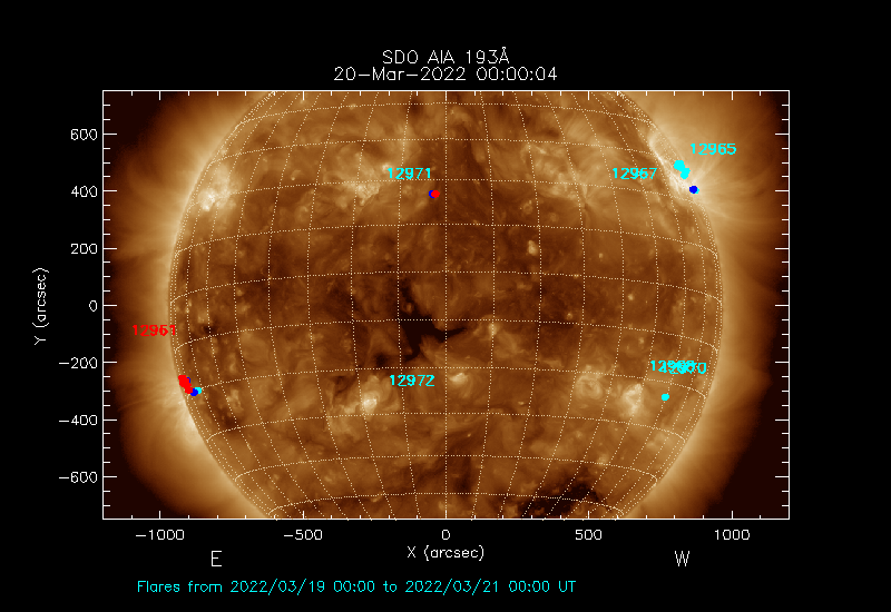 The most recent flares (≤12 hours) are shown as red dots, 12-24 hours ago as blue dots and older ones as turquoise dots.