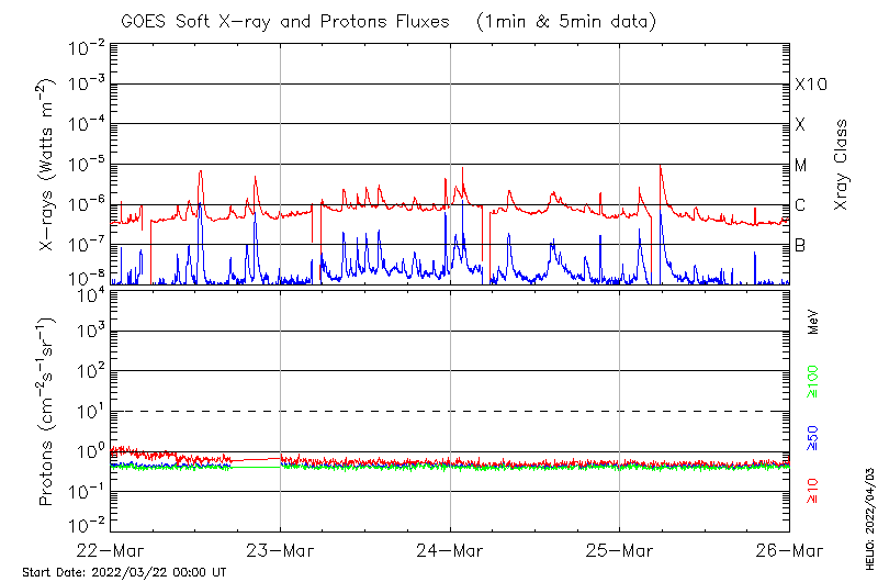 This page provides light-curves generated from GOES soft X-ray and Particle data for the date indicated at the top and the preceding three days.