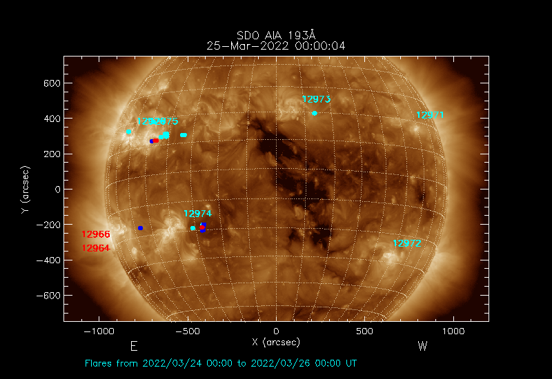 The most recent flares (≤12 hours) are shown as red dots, 12-24 hours ago as blue dots and older ones as turquoise dots.