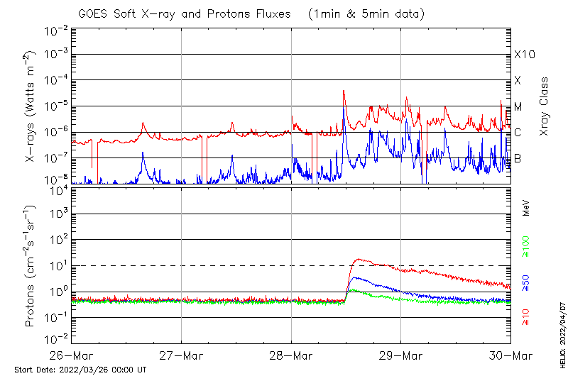 This page provides light-curves generated from GOES soft X-ray and Particle data for the date indicated at the top and the preceding three days.