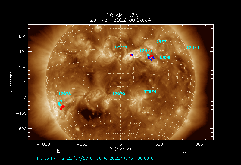 The most recent flares (≤12 hours) are shown as red dots, 12-24 hours ago as blue dots and older ones as turquoise dots.