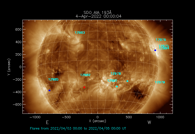 The most recent flares (≤12 hours) are shown as red dots, 12-24 hours ago as blue dots and older ones as turquoise dots.