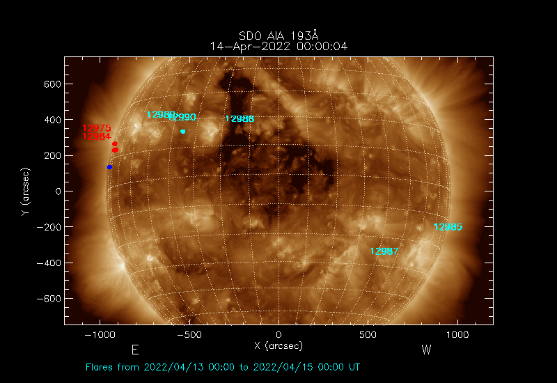 The most recent flares (≤12 hours) are shown as red dots, 12-24 hours as blue