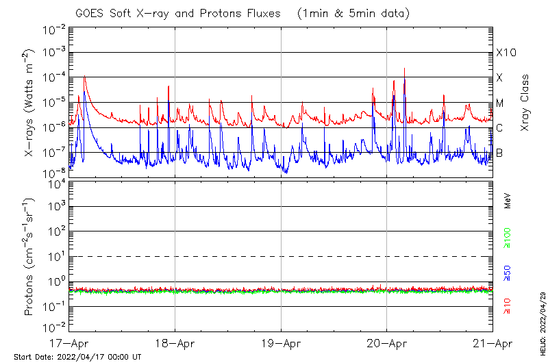 This page provides light-curves generated from GOES soft X-ray and Particle data for the date indicated at the top and the preceding three days.