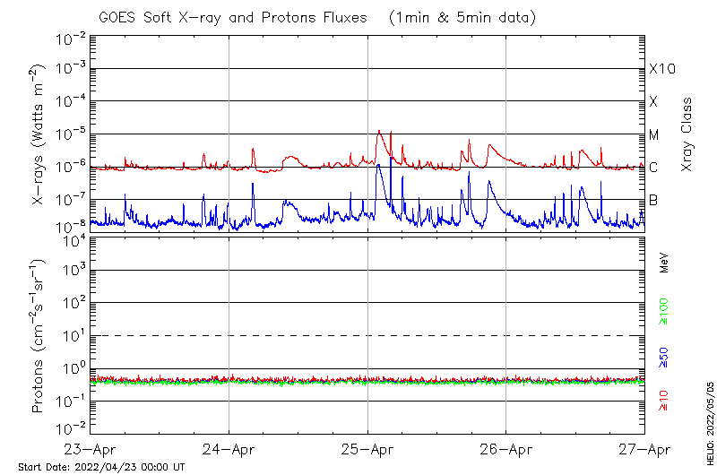 This page provides light-curves generated from GOES soft X-ray and Particle data for the date indicated at the top and the preceding three days.