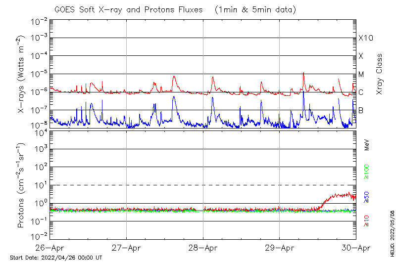 This page provides light-curves generated from GOES soft X-ray and Particle data for the date indicated at the top and the preceding three days.