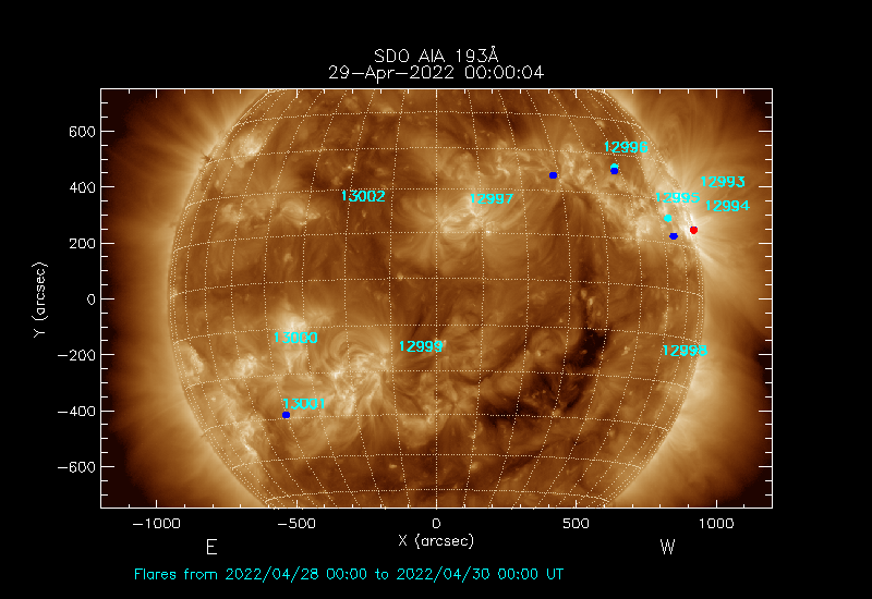The most recent flares (≤12 hours) are shown as red dots, 12-24 hours ago as blue dots and older ones as turquoise dots.