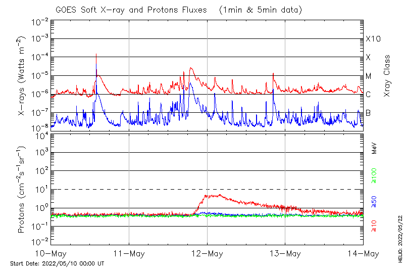This page provides light-curves generated from GOES soft X-ray and Particle data for the date indicated at the top and the preceding three days.