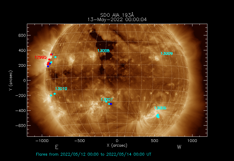 The most recent flares (≤12 hours) are shown as red dots, 12-24 hours as blue