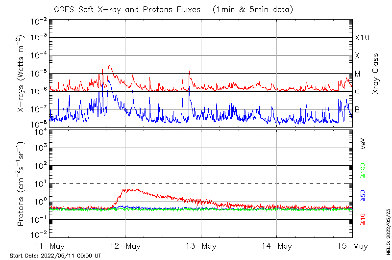 This page provides light-curves generated from GOES soft X-ray and Particle data for the date indicated at the top and the preceding three days.