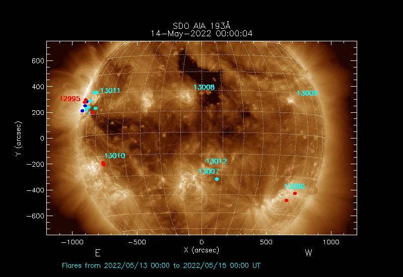 The most recent flares (≤12 hours) are shown as red dots, 12-24 hours as blue