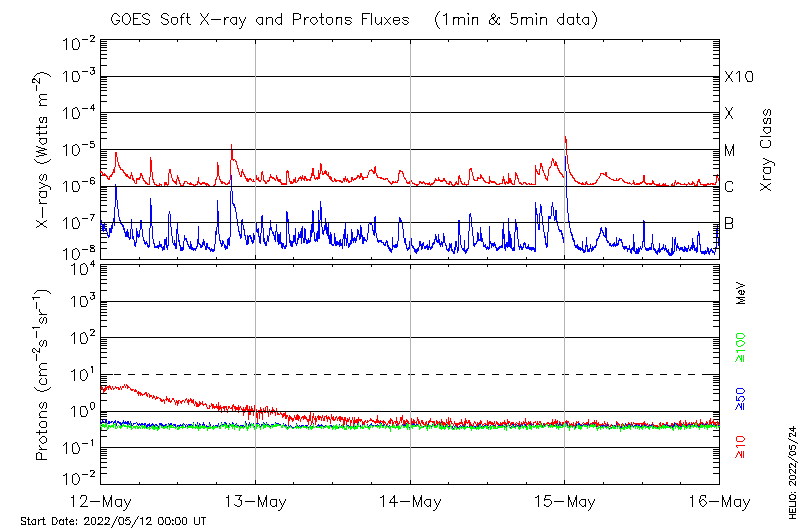 This page provides light-curves generated from GOES soft X-ray and Particle data for the date indicated at the top and the preceding three days.