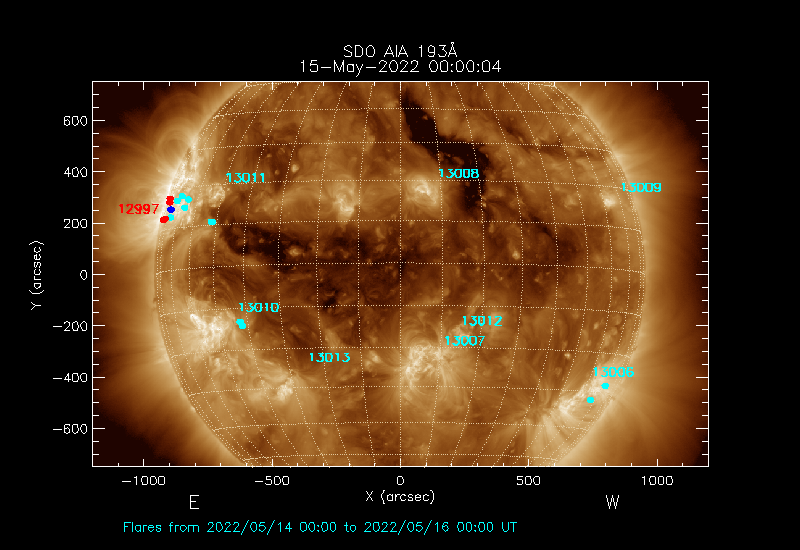 The most recent flares (≤12 hours) are shown as red dots, 12-24 hours ago as blue dots and older ones as turquoise dots.