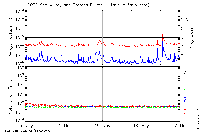This page provides light-curves generated from GOES soft X-ray and Particle data for the date indicated at the top and the preceding three days.