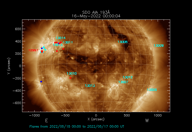 The most recent flares (≤12 hours) are shown as red dots, 12-24 hours ago as blue dots and older ones as turquoise dots.