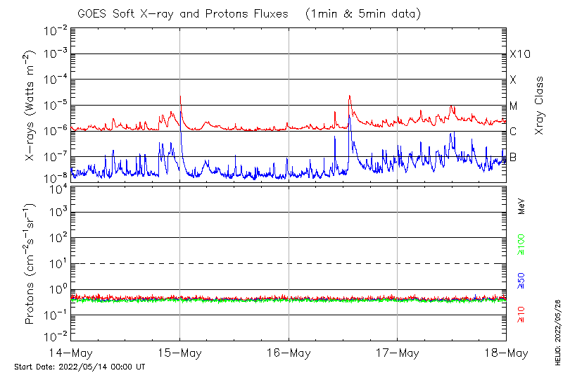 This page provides light-curves generated from GOES soft X-ray and Particle data for the date indicated at the top and the preceding three days.