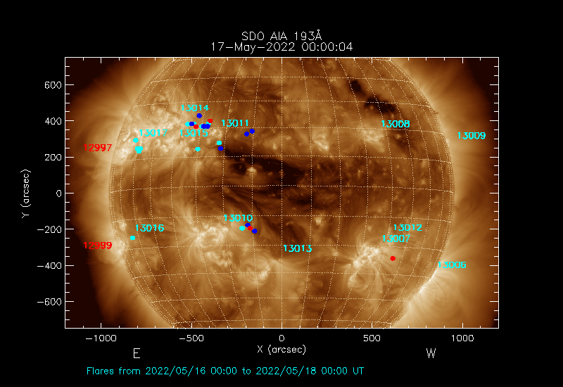 The most recent flares (≤12 hours) are shown as red dots, 12-24 hours ago as blue dots and older ones as turquoise dots.