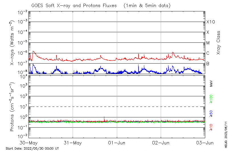 This page provides light-curves generated from GOES soft X-ray and Particle data for the date indicated at the top and the preceding three days.