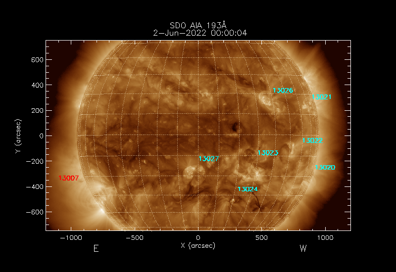 Click on an Active Region plot to display the Region Report including the region evolution and flaring history. HEC Search for NOAA Active Regions (SRS) records for this date and the day before.
