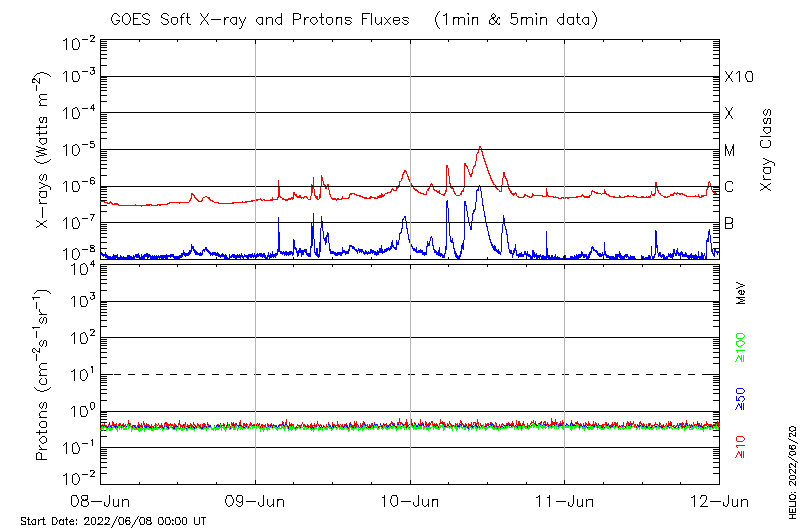 This page provides light-curves generated from GOES soft X-ray and Particle data for the date indicated at the top and the preceding three days.