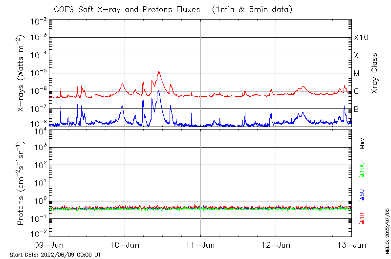 This page provides light-curves generated from GOES soft X-ray and Particle data for the date indicated at the top and the preceding three days.