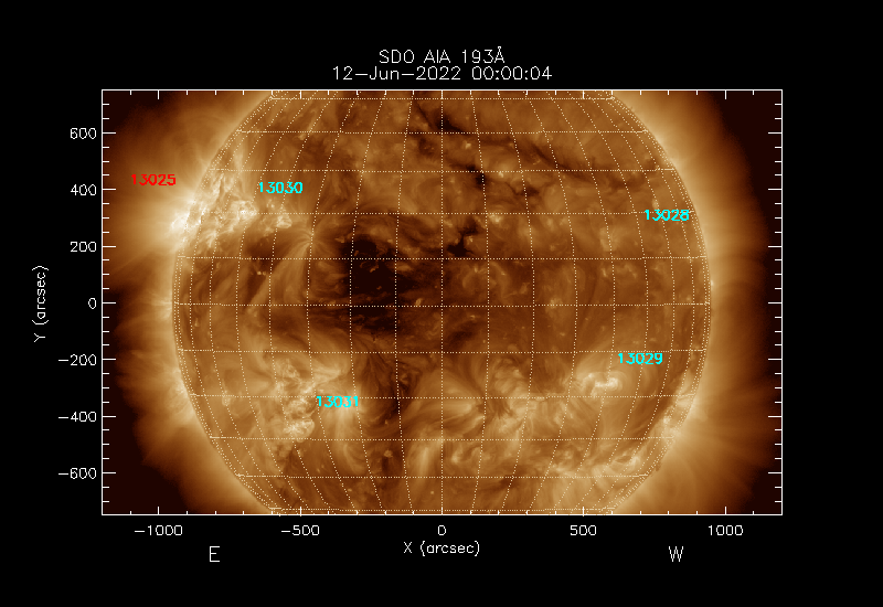 Click on an Active Region plot to display the Region Report including the region evolution and flaring history. HEC Search for NOAA Active Regions (SRS) records for this date and the day before.