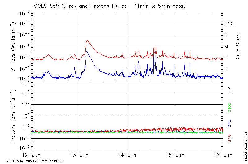 This page provides light-curves generated from GOES soft X-ray and Particle data for the date indicated at the top and the preceding three days.