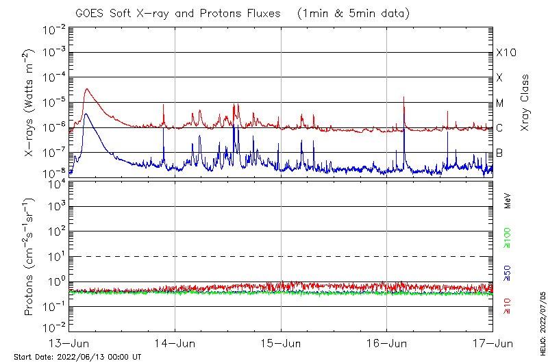 This page provides light-curves generated from GOES soft X-ray and Particle data for the date indicated at the top and the preceding three days.