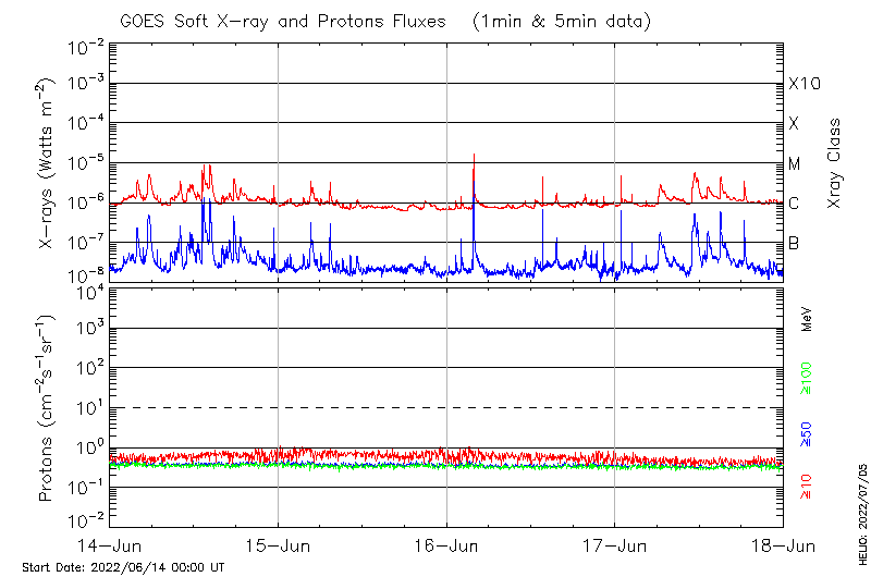 This page provides light-curves generated from GOES soft X-ray and Particle data for the date indicated at the top and the preceding three days.