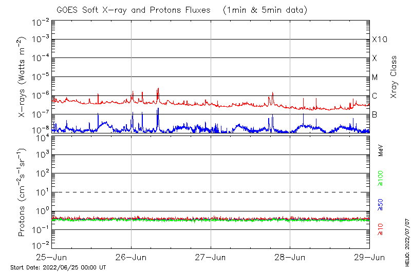 This page provides light-curves generated from GOES soft X-ray and Particle data for the date indicated at the top and the preceding three days.