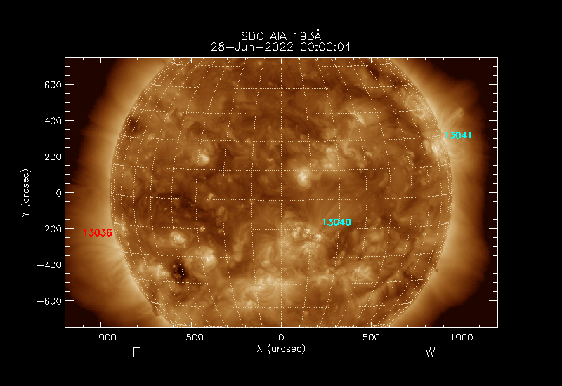 Click on an Active Region plot to display the Region Report including the region evolution and flaring history. HEC Search for NOAA Active Regions (SRS) records for this date and the day before.