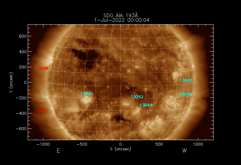 Click on an Active Region plot to display the Region Report including the region evolution and flaring history. HEC Search for NOAA Active Regions (SRS) records for this date and the day before.