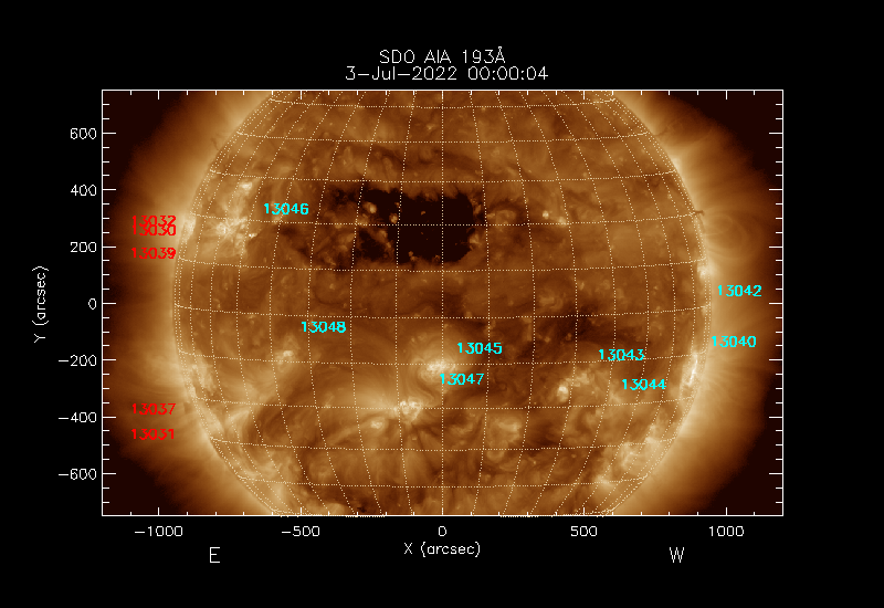 Click on an Active Region plot to display the Region Report including the region evolution and flaring history. HEC Search for NOAA Active Regions (SRS) records for this date and the day before.