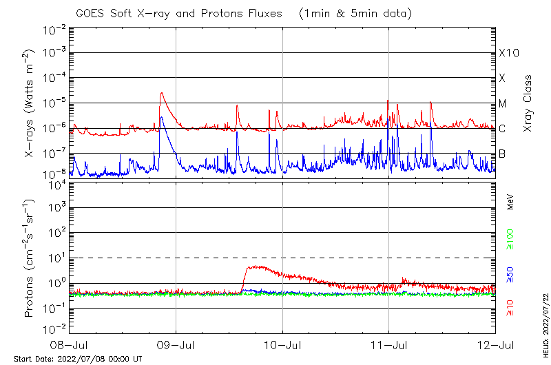 This page provides light-curves generated from GOES soft X-ray and Particle data for the date indicated at the top and the preceding three days.