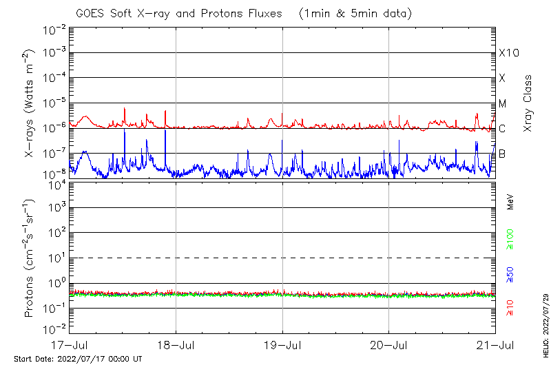 This page provides light-curves generated from GOES soft X-ray and Particle data for the date indicated at the top and the preceding three days.