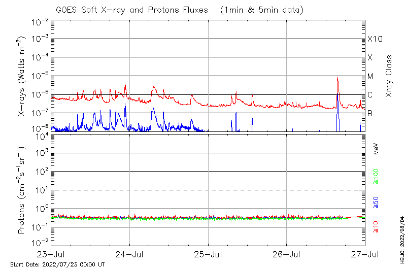 This page provides light-curves generated from GOES soft X-ray and Particle data for the date indicated at the top and the preceding three days.