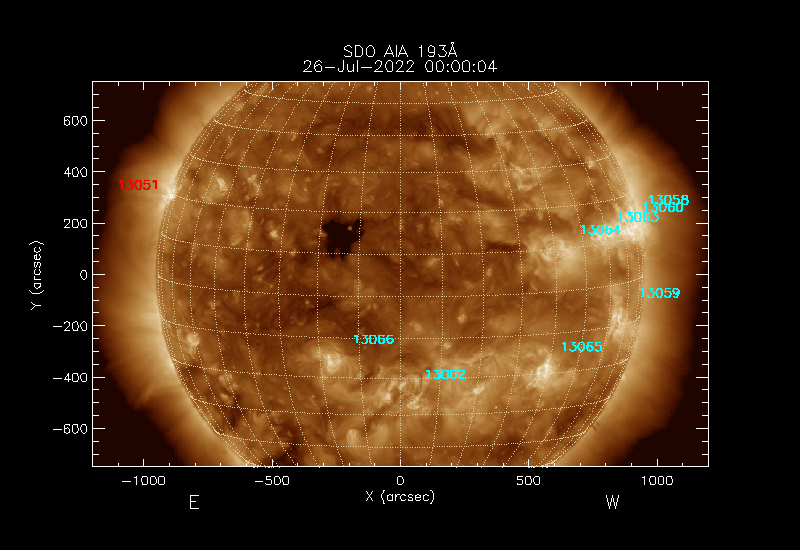 Click on an Active Region plot to display the Region Report including the region evolution and flaring history. HEC Search for NOAA Active Regions (SRS) records for this date and the day before.