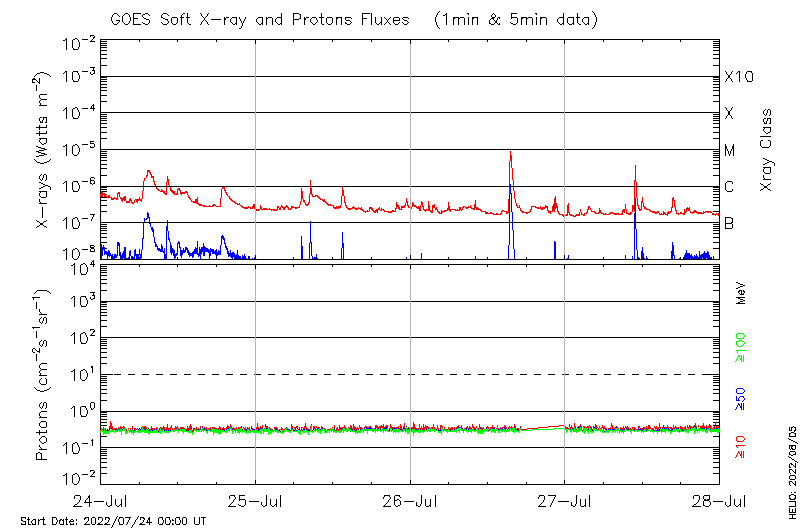 This page provides light-curves generated from GOES soft X-ray and Particle data for the date indicated at the top and the preceding three days.