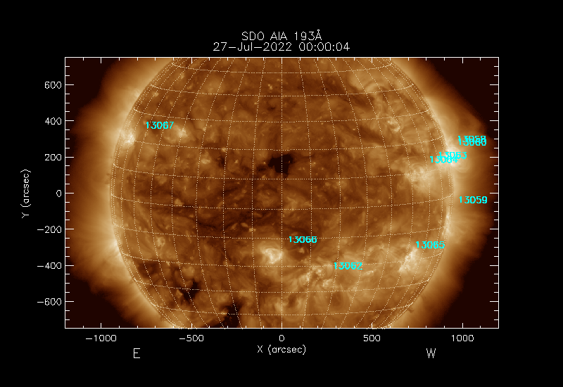 Click on an Active Region plot to display the Region Report including the region evolution and flaring history. HEC Search for NOAA Active Regions (SRS) records for this date and the day before.