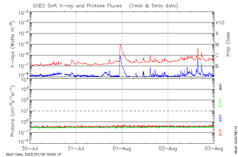 This page provides light-curves generated from GOES soft X-ray and Particle data for the date indicated at the top and the preceding three days.