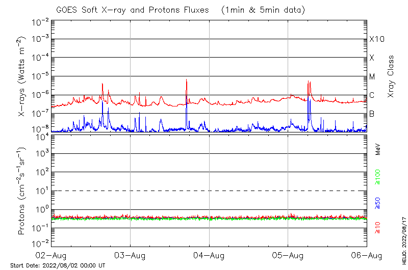 This page provides light-curves generated from GOES soft X-ray and Particle data for the date indicated at the top and the preceding three days.
