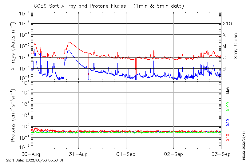 This page provides light-curves generated from GOES soft X-ray and Particle data for the date indicated at the top and the preceding three days.