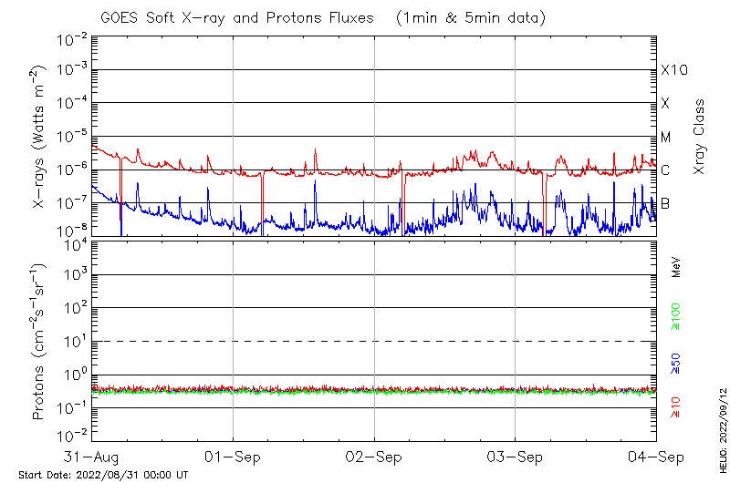 This page provides light-curves generated from GOES soft X-ray and Particle data for the date indicated at the top and the preceding three days.